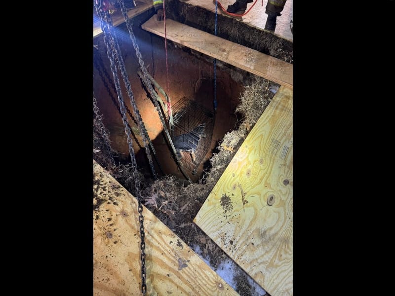 It was a normal Wednesday evening until about 8:30 pm, when Winnie’s owner let her out for a quick break. Seconds later, she heard a scared yelp and ran outside to find the pup at the bottom of what looked like a 50-foot sinkhole in the backyard. An old well had collapsed, and poor pup Winnie had fallen all the way down. The Lynchburg Fire Department got the call right away. Their crews had just wrapped up a structure fire on Campbell Avenue, and they rolled straight from that scene into this one. Already focused and working a plan. Soon after, they reached out to us at Bee Line Transport for towing help. We were eager to help, as we’ve never done a Lynchburg wrecker service in support of a dog rescue before.